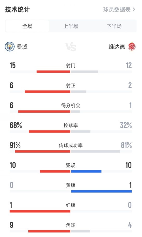 曼城20维达德全场数据:射门1512,射正62,控球率68%32%